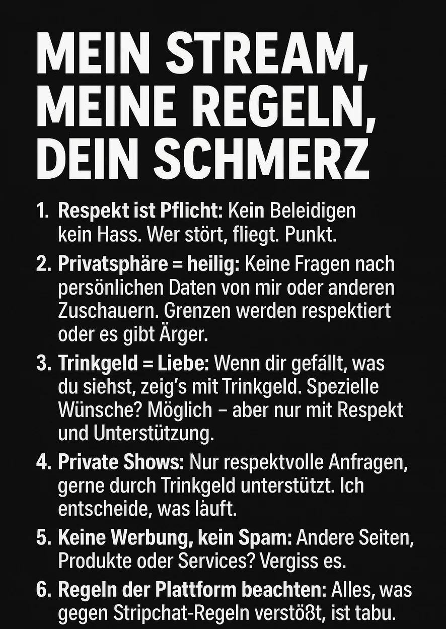 5. Privatsphäre respektieren: Keine Anfragen nach persönlichen Informationen des Models oder der Zuschauer. Der Schutz der Privatsphäre hat oberste Priorität.