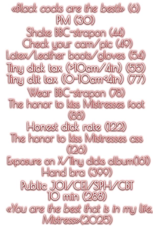 The Mistress is a rough, cruel, arrogant and greedy bitch. A boy with a tender soul can be offended. Are you ready to be humiliated?
